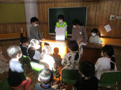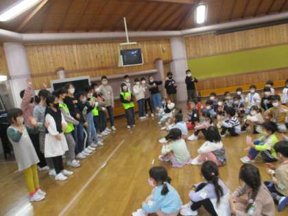 健診が終わった後は、5年生みんなで考えた「お楽しみタイム」を班ごとに行いました。メダル渡し・読み聞かせ・クイズ・お絵かき等、年長さんが楽しめるように準備してきました。別れ際、ずっと手を振り合う5年生と年長さんの姿が印象的でした。