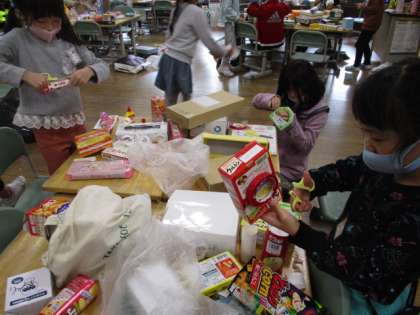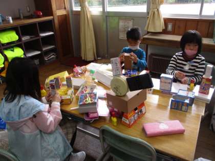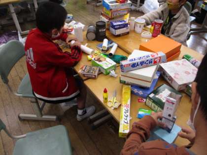 箱や材料の材質や大きさによって、接着の方法が違うことも学びました。でき上がった後は、「これ何だろう」「ここおもしろいね」と友達同士で会話しながら見て楽しみました。