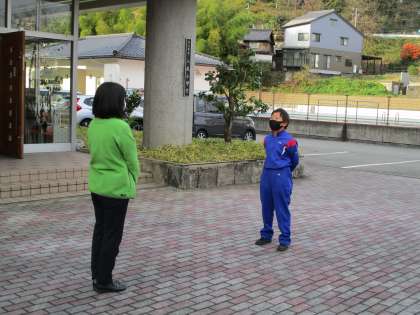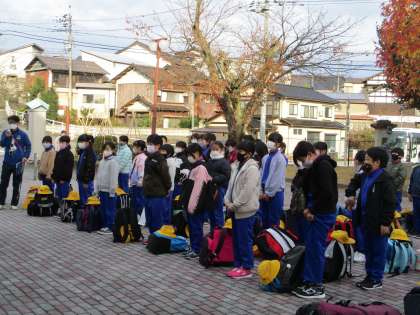 清々しい秋晴れの中、4年生は呉羽青少年自然の家へ校外活動へ行ってきました。出発式は、「いろいろなことにチャレンジし、友達の良さをたくさん見つけたい。」という代表の挨拶のもと、「行ってきます!」と元気よく学校を出発しました。