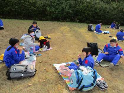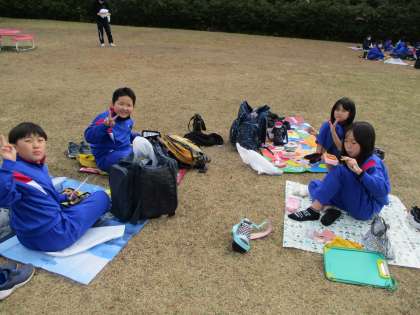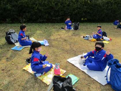 待ちに待った昼食タイムです。おうちの方の愛情たっぷりお弁当を青空の下でいただきました。