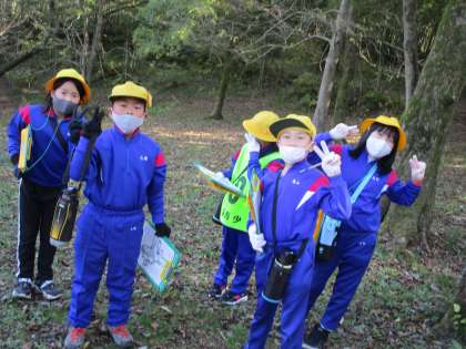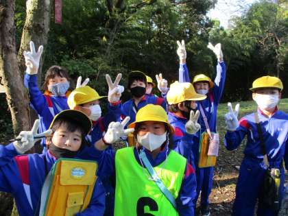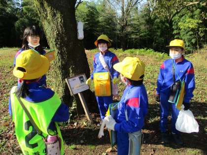 午後の活動「森の動物オリエンテーリング」です。班のみんなと協力して、ポイントを見付けました。少し遅れた友達に「大丈夫?疲れた?」と優しく声をかける子や、ポイントを探しながらゴミを拾う子供たちの姿がありました。
