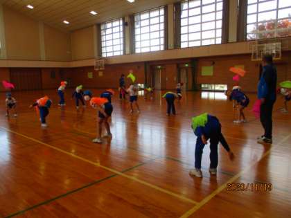 今日は、スポーツ指導員の方が学校に来てくださって、いろいろな運動を教えてくださいました。いつもの動きと違う動きをすることや、フラフープでペアになって動きを伝える活動、左右の違いを意識してふわふわ落ちてくるハンカチつかむ活動などを行いました。みんな笑顔いっぱいで運動に取り組んでいました。