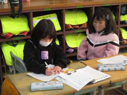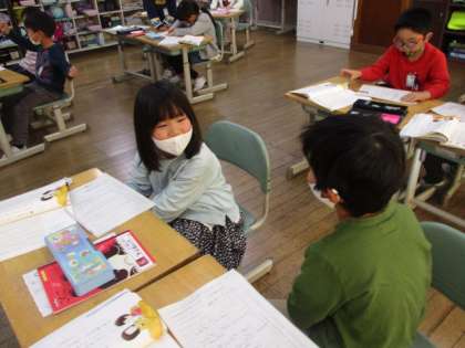 国語科では、友達に質問したことを文にまとめて、みんなに紹介する活動に取り組んでいます。まずは、友達が今一番楽しいと思っていることを聞き、ワークシートにまとめています。友達の言った答えを一生懸命書いていました。「聞こえなかったから、もう一回言ってくれる?」というやりとりも自然にできるようになってきました。