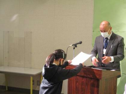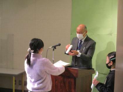 防火ポスターで努力賞を受賞した二人と、マラソン記録会で1位だった子供たちの授賞式が行われました。