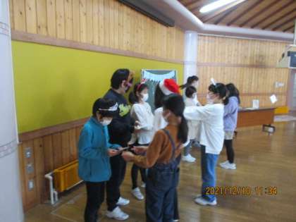 3・4時間目にバースデー会社さんが提案したお楽しみ会を行いました。「震源地は誰だゲーム」や「私はだれでしょうゲーム」等、密にならない遊びをみんなで楽しみました。最後には、12月生まれの人にプレゼント渡しが行われました。