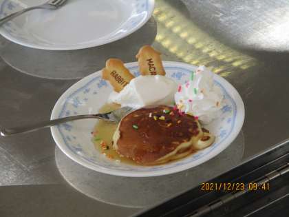 一人一人美味しそうに盛りつけられたホットケーキ。みんなの楽しんでいる様子が伝わってきます。