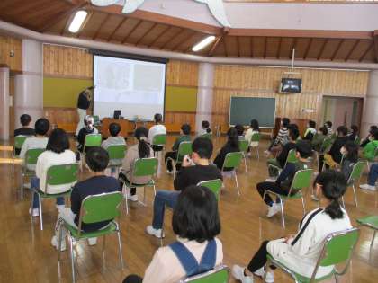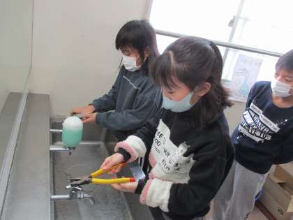 今日は、ゲストティーチャーをお招きして「節水」について学習しました。水道を「蛇口」や「カラン」と呼ばれるようになった由来や蛇口の仕組み、水の出し過ぎを防ぐためのアイテム「節水コマ」について分かりやすく教えていただきました。