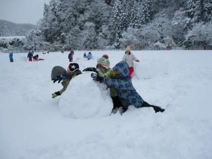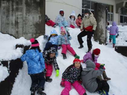 今日は雪あそびをしました。雪合戦をしたり、すべり台や大きな雪だるまを作ったり、それぞれ仲良く楽しむことができました。またみんなで遊びたいですね。