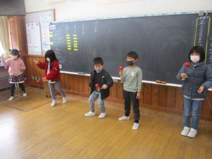 生活科では、自分が達人になりたい遊びを練習しています。少しずつ出来る技を増やしたり、より綺麗に見えるように工夫したりしています。