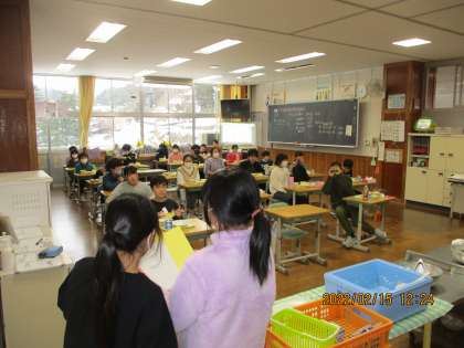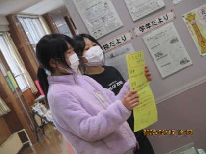 5年生の委員の子たちが、6年生の卒業を祝うイベント「特別貸し出し」「図書予約優先」の紹介をしに来てくれました。貸出冊数が、6年生だけ他の学年より増えることと、借りたい本の予約ができるという内容です。卒業まで残り20日あまりとなりましたが、心残りがないように図書室の本を読破してほしいと思います。