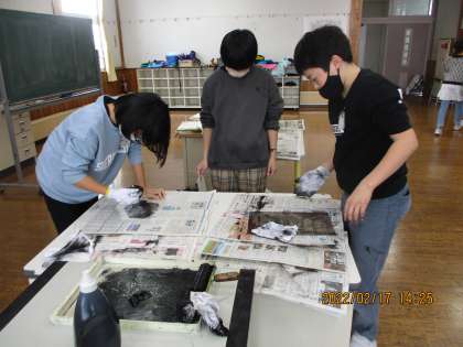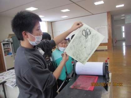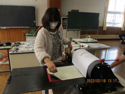 ニードルを使って溝をつくった版にインクを付け、プレス機で刷っていきます。出来上がった作品を見て喜ぶ姿、プレス機のハンドルを回して運転気分を楽しむ姿など、見ているとこっちまでほっこりします。