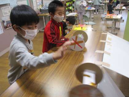 図画工作科で作っていたかみざらコロコロが完成しました。友達と一緒に転がして楽しむ様子が見られました。緩やかコースと急コースを使って、色や模様の見え方をたくさん試しました。世界に一つだけの作品がまた完成して、うれしいですね!