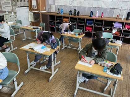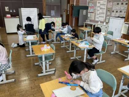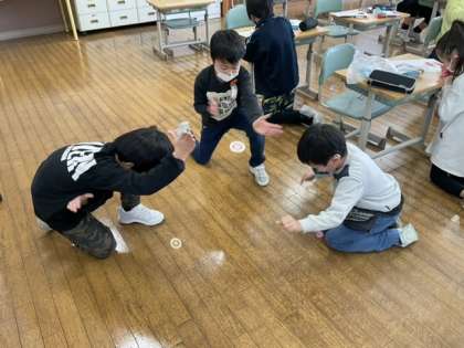 コンパスで模様を描いたコマをつくりました。模様の描き方や、よく回るように工夫する姿が素敵でした!