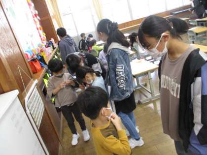 初めて一緒に登校した日は、登校後にすべきことを優しく分かりやすい言葉で教えてあげていました。名札を付けるのは、少し難しかったようです。6年生は、様子を見ながら、自分でチャレンジさせたり少し手を貸したりしていました。