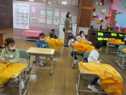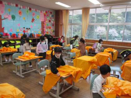 今日は朝からの雨で、子供たちは合羽を着て登校しました。これからの登下校に備えて、今日は学級活動の時間をつかって、合羽の着脱や雨具かけへのかけ方などを練習しました。