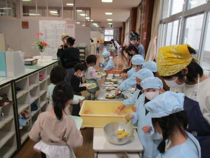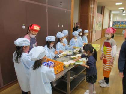 入学後、わずかな期間の間に、子供たちは着実にできることを増やしています。給食の準備にも少しずつ慣れてきて、上手になってきました。