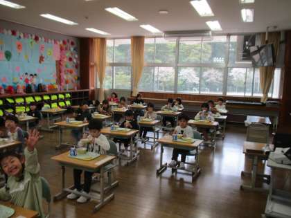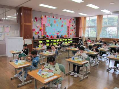 給食を食べるときには、全員が同じ方向を向いて、静かに食べています。食べ終わっても、静かに待てるようにがんばっています。