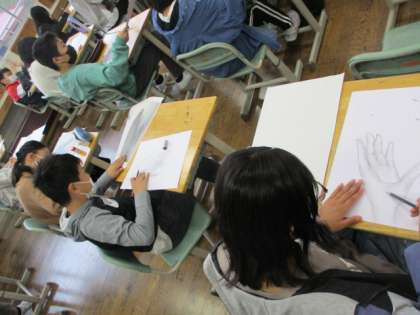図画工作科では、自分の思いを「手」と「言葉」で表す学習に取り組みました。今年頑張りたいことや目指す自分像にぴったりな手の形を探し、じっくりとデッサンしました。学習参観の際は、力作をぜひご覧ください。