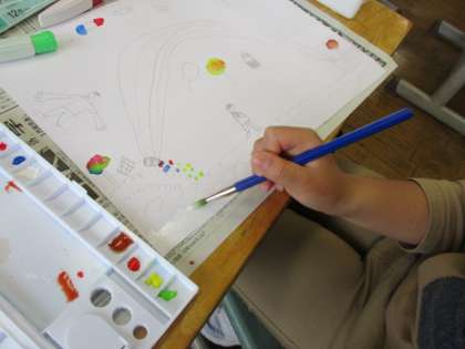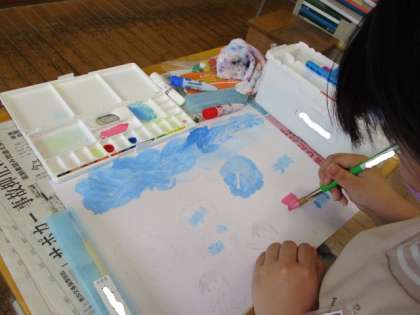 今日の図画工作科では、前回学んだことを生かして水彩の作品を作りました。複数の色を重ねてぼかしたり、少しずつ白を加えて色味を変えていったりしました。