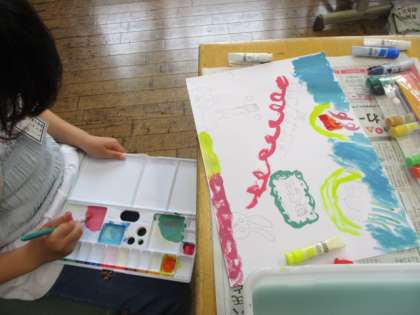 振り返りでは、「自分だけの色が作れて楽しかった」と、水彩のよさに気付いている子がいました。友達がどんな世界を描いたのか、見るのが楽しみですね。