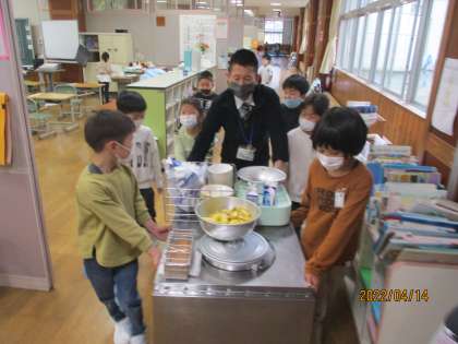 ふと見ると、2年生の子供たちが、1年生の給食の片づけをお手伝いしていました。やる気いっぱい、やさしさいっぱいの2年生です。