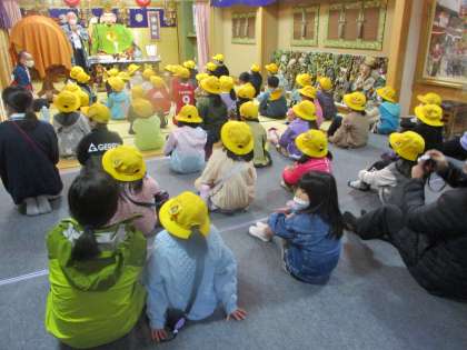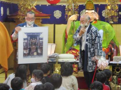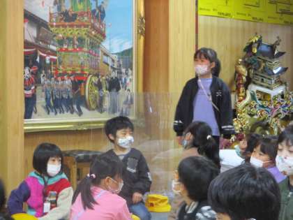 調曳きの日、あいにくの雨で曳きまわしはできませんでしたが、2年生は西町の公民館で西町の曳山や神様についてお話を伺いました。子供たちは、初めて聞く話に興味津々でした。