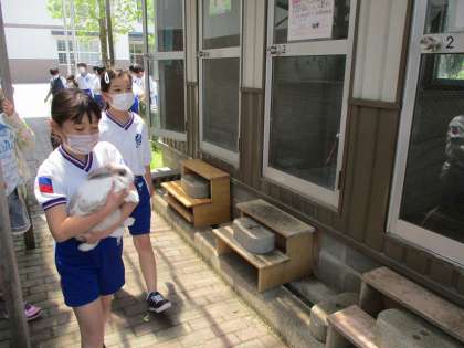 理科の学習でウサギのほねときん肉の観察をしました。ウサギのからだに優しく触れながら、観察することができました。