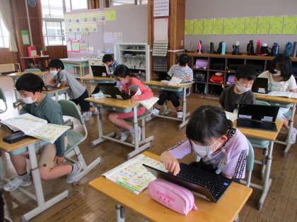 4年生では、漢字で都道府県名を書く学習があります。まずは住んでいる富山県を含む中部地方の県名と場所を覚えられるよう練習しています。それに合わせて、日本中の都道府県の場所や形をクイズ形式で、地図帳と見比べながら学習に取り組んでいます。新聞やニュース等、いろいろなところで話題に上がる都道府県について、意識してほしいと思います。