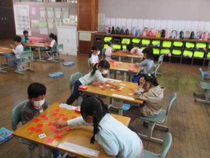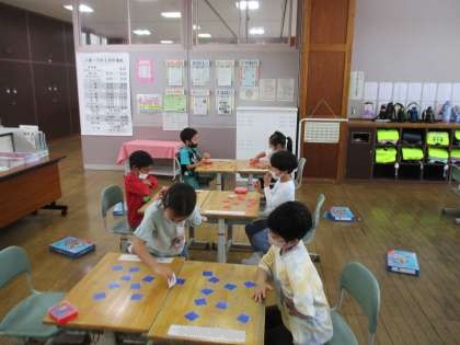 これまで、ブロックの数を数える学習、色玉で表された数を数える学習等を行ってきましたが、今回の学習では「数字」で表された数が分かり、合わせたり大きさを比べたりすることを目当てに行いました。