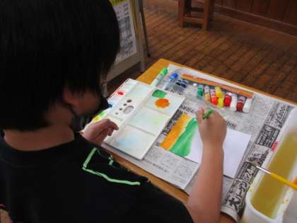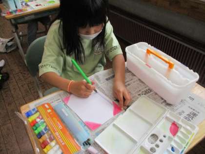 学級目標の掲示を作るために、画用紙に色を塗りました。水彩道具の使い方にも慣れてきて、混色をしたり水でうすめたりするのも手早くなりました。