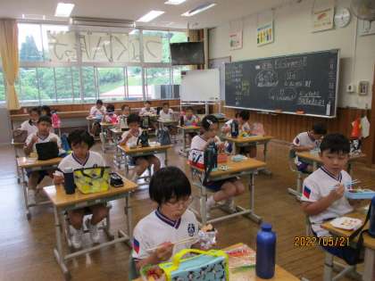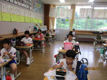 本来なら、運動会の興奮を伝えたり思いを語り合ったりしながら食べたいのですが、残念ながら今はまだ黙食です。それでも、お家の方に作っていただいたお弁当を楽しそうに食べていました。