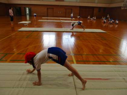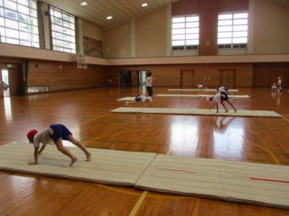 今日の体育科では、マット運動をしました。手足を大きく動かして動物の動きを再現しました。ひざを伸ばして、ゆっくりをクマさん歩きをしています。膝を大きく曲げてワニさん歩きをしています。