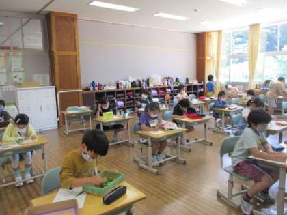 土日はカイコのお世話をありがとうございました。子供たち、そしておうちの方のご協力のおかげでカイコはすくすくと元気に育っています。「この土日で急に大きくなったよ!」と話す子もいました。今日じっくりと観察をすると、「おしりの方に三角のものが出来ているよ」「本当だー!」とカイコの姿が変わっていくことに気付きました。