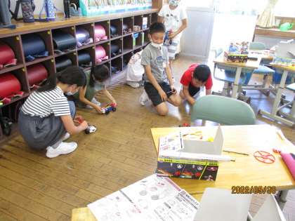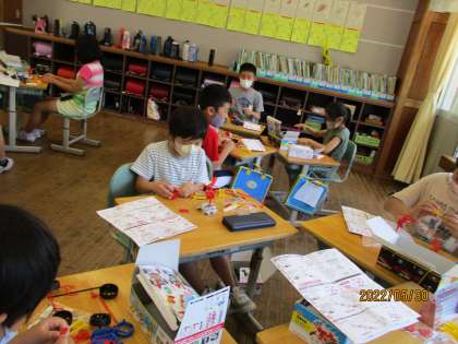 理科「電流のはたらき」では、モーターと乾電池をつないで車を動かす学習を行いました。班のみんなで教え合って電気の回路をつなぎました。
