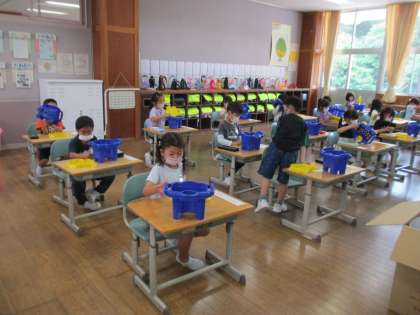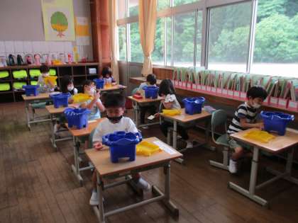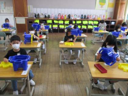 この日の学習では、それぞれにポット(はち)を配り、記名し、自分好みに模様を描きました。