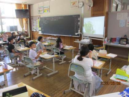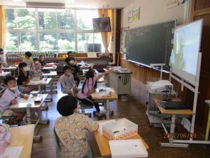 だいぶ大きくなってきたカイコの観察をしました。「じっとしていて動かない。」「すごくたくさん食べている!」「体の黒い筋が太くなったり、細くなったりしている。」子供たちは、気付いたことをどんどん口にしながら、興味をもって観察していました。途中でMさんのカイコが脱皮をしていることに気付き、大画面に映しながらみんなで観察しました。「頑張れ〜、あとちょっとだよ!!」と応援しながら様子をじっと見続け、終わったときには拍手と歓声が聞こえてきました。とっても貴重な体験をすることができました。