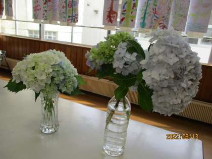 二人の子供が、あじさいの花を家から持ってきてくれました。教室に花があると、気持ちまで明るくなります。
