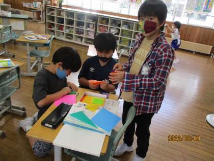 SDGsを呼びかけよう係の子供が、SDGsのマスコットキャラクターGs君を折り紙で折っていました。へびのようにくねくねと動いて、みんな興味津々です。作り方を教えてもらって、一緒に作っていました。