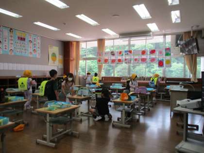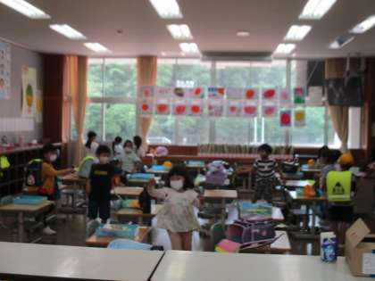 登校してきた子供たちは、楽しみながら自分の席を探し、朝の準備に取り掛かっていました。