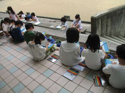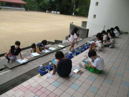 生活科で育てているアサガオの芽が、ますます大きくなってきました。現在は子葉だけですが、もうすぐ葉も出てきそうです。大きくなった芽の観察を行い、記録を取りました。