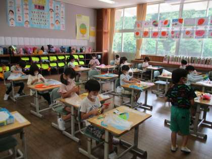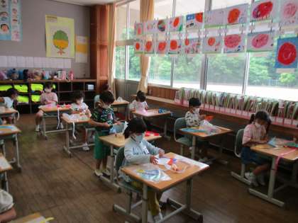 折り紙をいろいろな形に切り取り、紙テープにはりつけて、教室の後ろに吊り下げました。