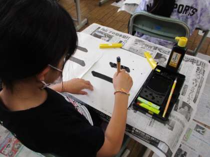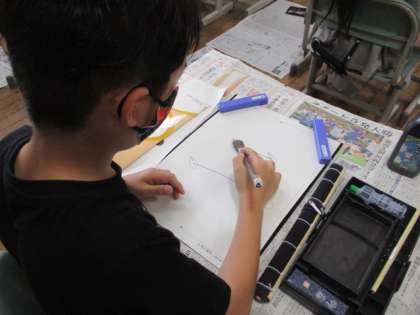 書き始めと書き終わりの筆の向きに気を付けて「二」という字を書きました。スー、トンなど筆を動かす音も意識して書いています。墨を付けずに何度も練習している姿もいいですね。