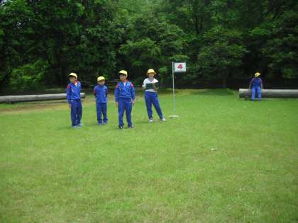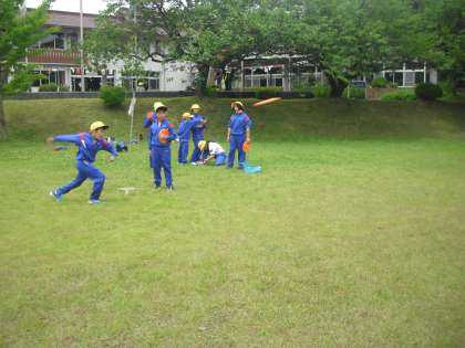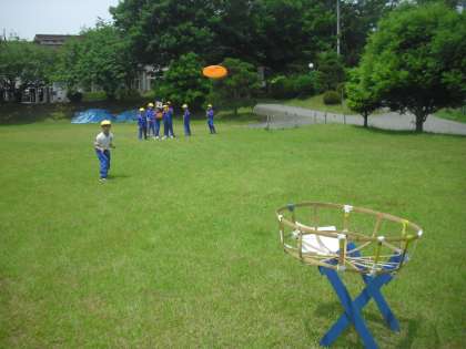 4年生は、呉羽青少年自然の家へ宿泊学習に出かけてきました。最初の活動は、フライングゴルフです。遠く離れたホールに入れるために、狙いを定めてディスクを投げました。