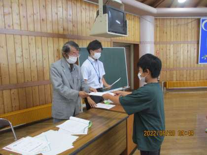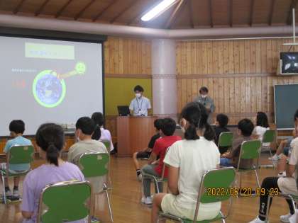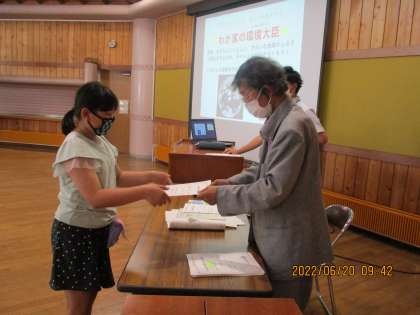 環境チャレンジ教室を開催しました。推進委員の方からお話を聞かせていただき、「我が家の環境大臣」に任命していただきました。夏休み中、家族のみんなで地球温暖化防止に向けて、できることにチャレンジしていってもらいたいと思います。