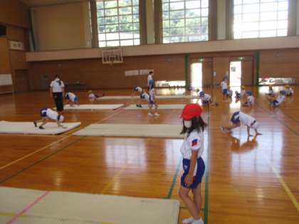 富山県体育文化センターと富山市総合体育館から3名の先生に来ていただき、マット教室を行いました。