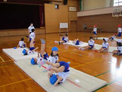 「前転がり」や「後ろ転がり」のポイントを教えていただいて練習しました。