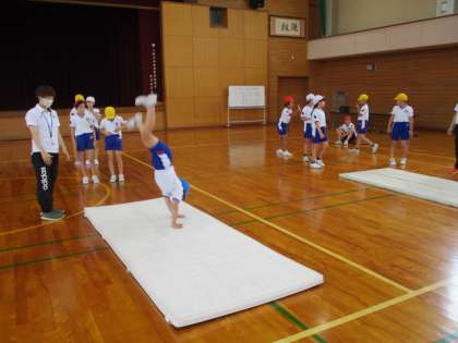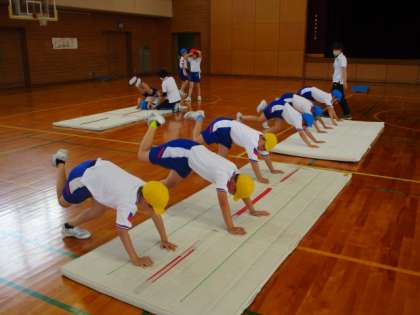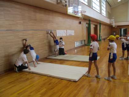 今日は、スポーツ指導員の方々に来ていただき、マット運動を教えていただきました。側転や倒立に挑戦したり、綺麗に後転ができるように練習したりしました。コツを聞いて繰り返し練習することで、とても上手に技を成功することができました。体育で、また色々な技に挑戦していきたいですね。