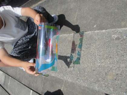 「地面に近づけると色が濃くなる!」「友達の作品と重ねると、違う色になるよ」と、気づきがいっぱいありました。