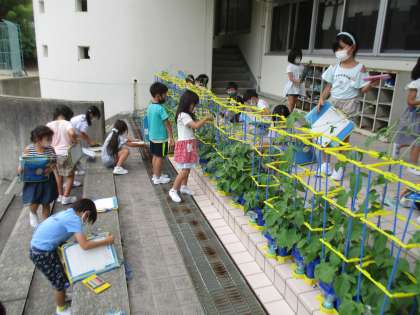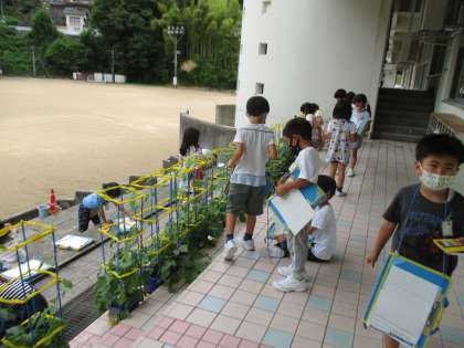 生活科で育てているアサガオが大きく伸びてきました。葉がとても大きくなり、つるが長く伸びてきた様子に気づいた子供たちはとても驚いていました。早速、観察したことを絵や文章で記録しました。