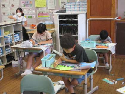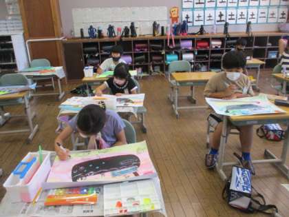 図画工作で取り組んでいた作品が完成しました。今日は、船の上の人物や、海や空にいる生き物を絵に描き込みました。動きが出るように、手や足の向きを考えて下絵を描き、丁寧に色を塗りました。一人一人思いをもって船の名前をつけたので、タイトルにも注目してみてください!